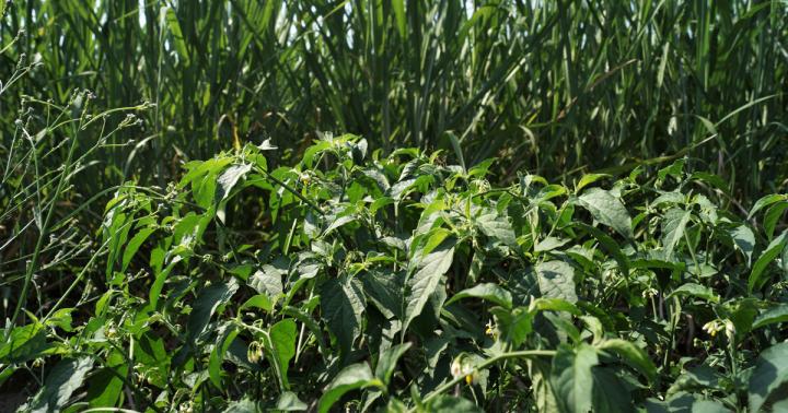 image: Divine nightshade in foreground with sugarcane in background. Weeds steal nutrients and sunlight from crops - and nightshade can reduce sucrose yields in sugarcane by up to 43%. Researchers are looking at ways to control this weed through heat treatment.