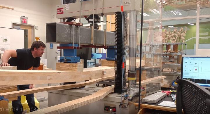 Clouston and her team of researchers tested the eastern hemlock and eastern white pine in the UMass Wood Mechanics Lab at the Olver Design Building. They made the composite building panels by gluing together wooden boards from hemlock and pine trees that were grown in the region.