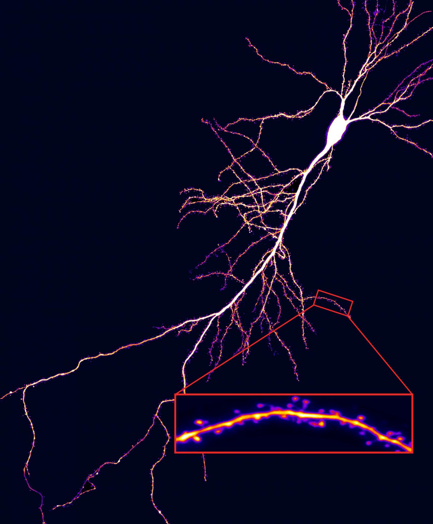 image: Dendritic spines are visible on a micrograph of a hippocampal neuron, taken using 2-photon microscopy.