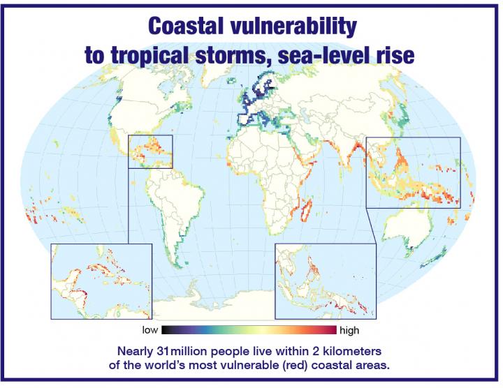 The authors found that 30.9 million people globally live in regions that are most vulnerable to tropical storms and projected sea-level rise.