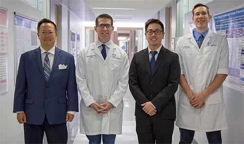 image: UA surgeons are studying a new technique to detect urine blockage. From left to right: Benjamin Lee, M.D.; Matthew Gretzer, M.D.; Sunchin Kim, M.D.; and Cameron Hinkel, M.D.