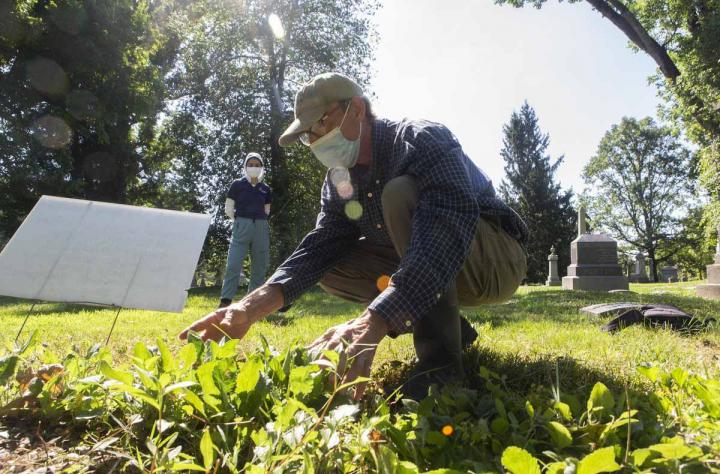 image: UC biology professor Denis Conover kneels over the grave of E. Lucy Braun at Spring Grove Cemetery & Arboretum.