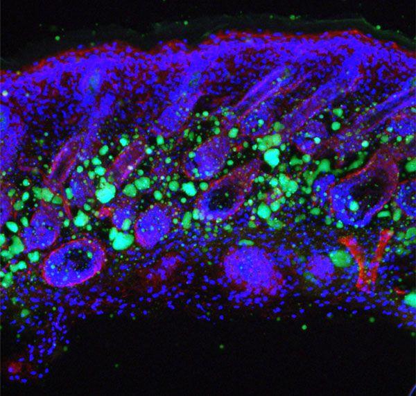 image: This is a microscopic image of the skin reveals skin cells in blue and fat cells in green. The fat cell layer forms the final barrier against bacteria entering deep into the body.