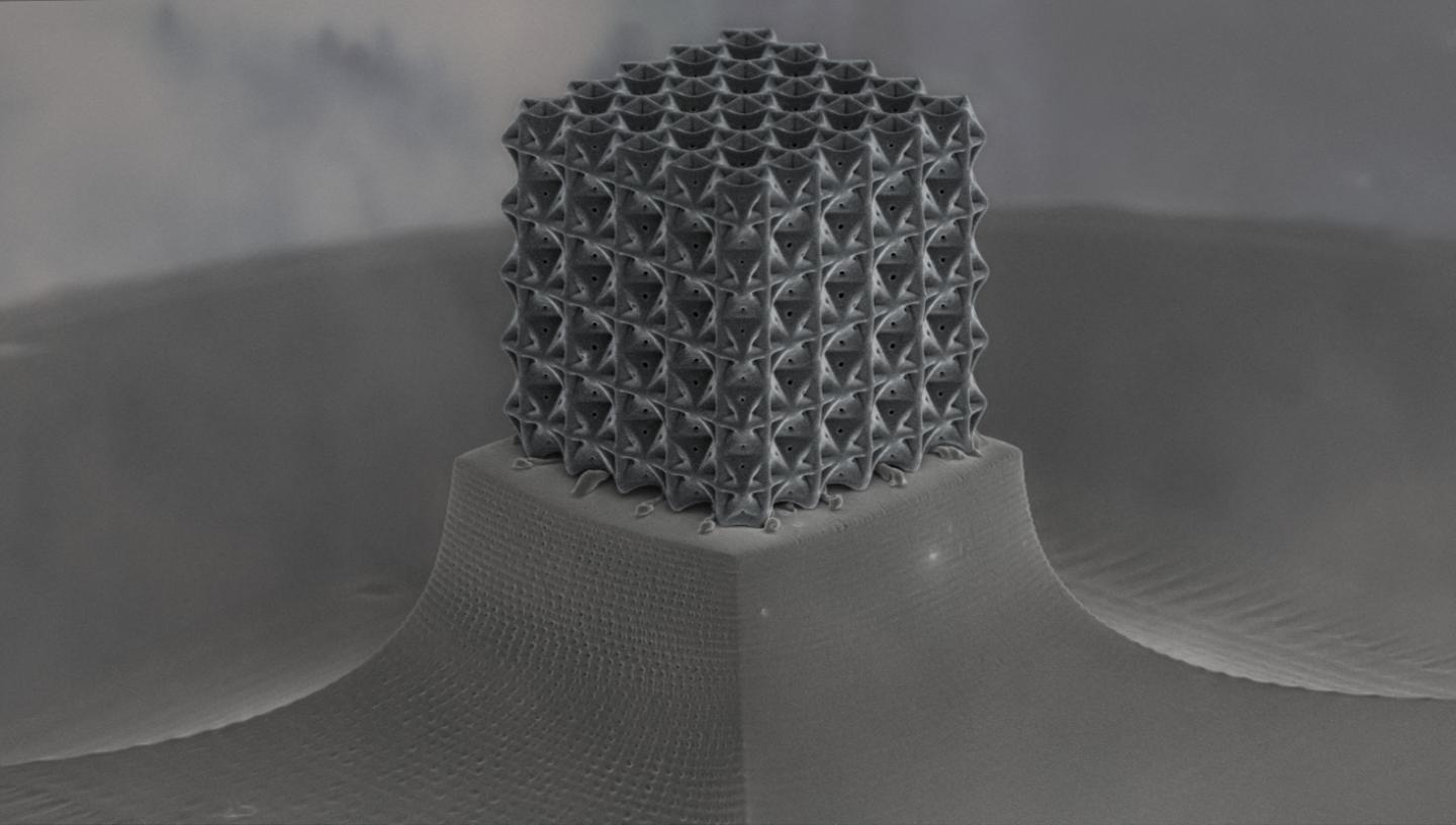 Bauer said the team's achievement rests on a complex 3D laser printing process called two-photon lithography direct laser writing. As an ultraviolet-light-sensitive resin is added layer by layer, the material becomes a solid polymer at points where two photons meet. The technique is able to render repeating cells that become plates with faces as thin as 160 nanometers.
