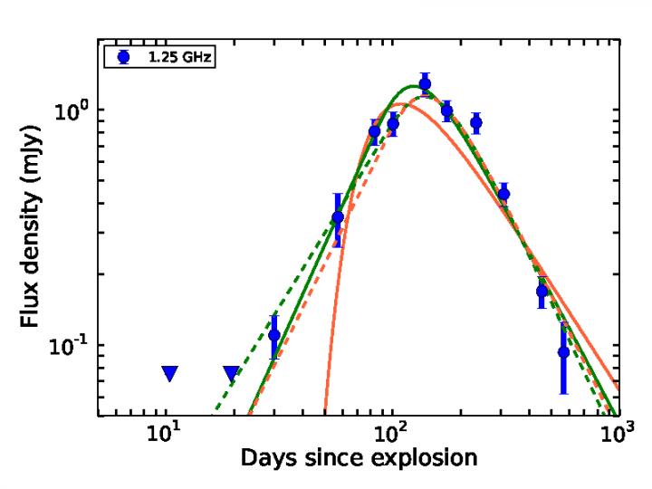 image: The green and red solid/dotted lines denote different theoretical models. The turn over point of this light curve enabled the determination of material velocity from the explosion, magnetic field strength, and environmental density at different distances from the explosion centre.