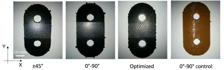 "Although of course we only tested four configurations, it does look like the optimized configuration may be the absolute best in practice because the configurations that would most commonly be used in design, such as 0°-90° or ±45° alignments, were more compliant or less stiff than what this one was," Lambros said. "The interesting thing that we found is that the sample optimized to be the stiffest also turned out to be the strongest. So, if you look at where they break, this one is at the highest load. This was somewhat unexpected in the sense that they had not optimized for this feature. In fact, the optimized sample was also a bit lighter than the others, so if you look at specific load, the failure load per unit weight, it's a lot higher. It's quite a bit stronger than the other ones. And why that is the case is something that we're going to investigate next."