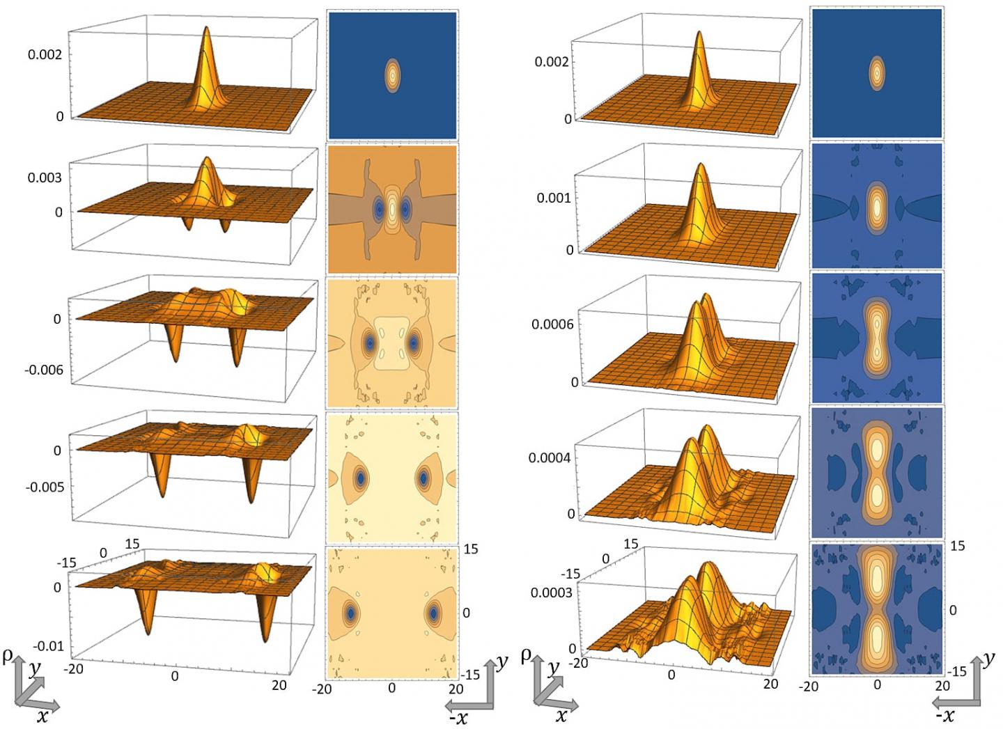 image: In an ultracold atomic experiment proposed by Rice University physicists Matthew Foster and Seth Davis, quantum fractionalization would be observed by density waves propagating in the direction of 1D quantum waveguides (left). In the absence of fractionalization (right), density waves would spread in a perpendicular direction.
