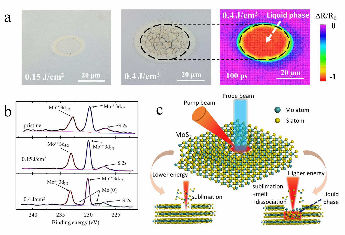 image: a Optical images of the final structures and comparison with the transient reflectivity image at a 100 ps delay time. b Comparison of the XPS Mo 3d spectra of pristine and laser-treated MoS2. c Schematic of ablation processes in different fluence cases.