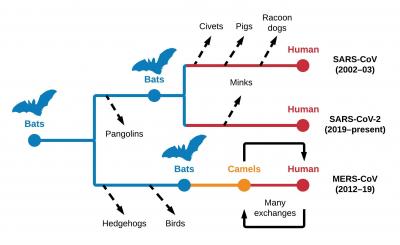 1) Bats have been ancestral hosts of human coronaviruses in the case of SARS-CoV and SARS-CoV-2. Bats also were the ancestral hosts of MERS-CoV infections in dromedary camels that spread rapidly to humans.