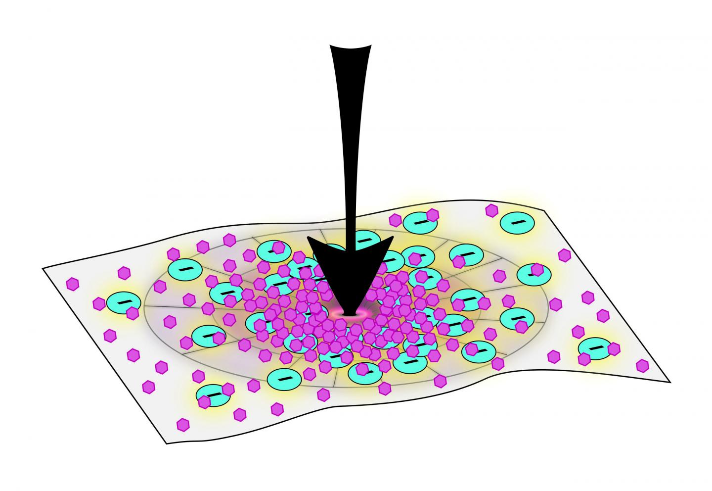 image: For the JHU team's experiment, increased force (arrow pointing down) applied on the material led to more electrical charges, and thus, more mineralization.