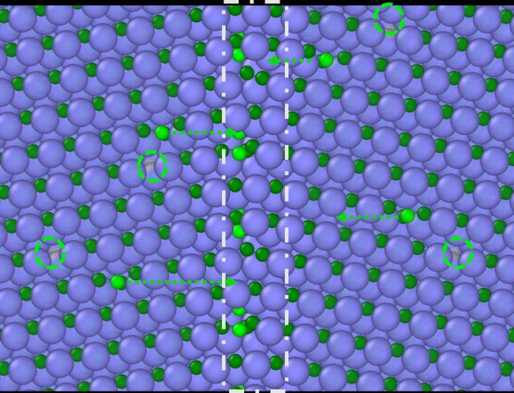 image: Silicon carbide after irradiation, in which loose carbon atoms (green) move toward the boundary (dashed line) between grains of the crystalline ceramic.