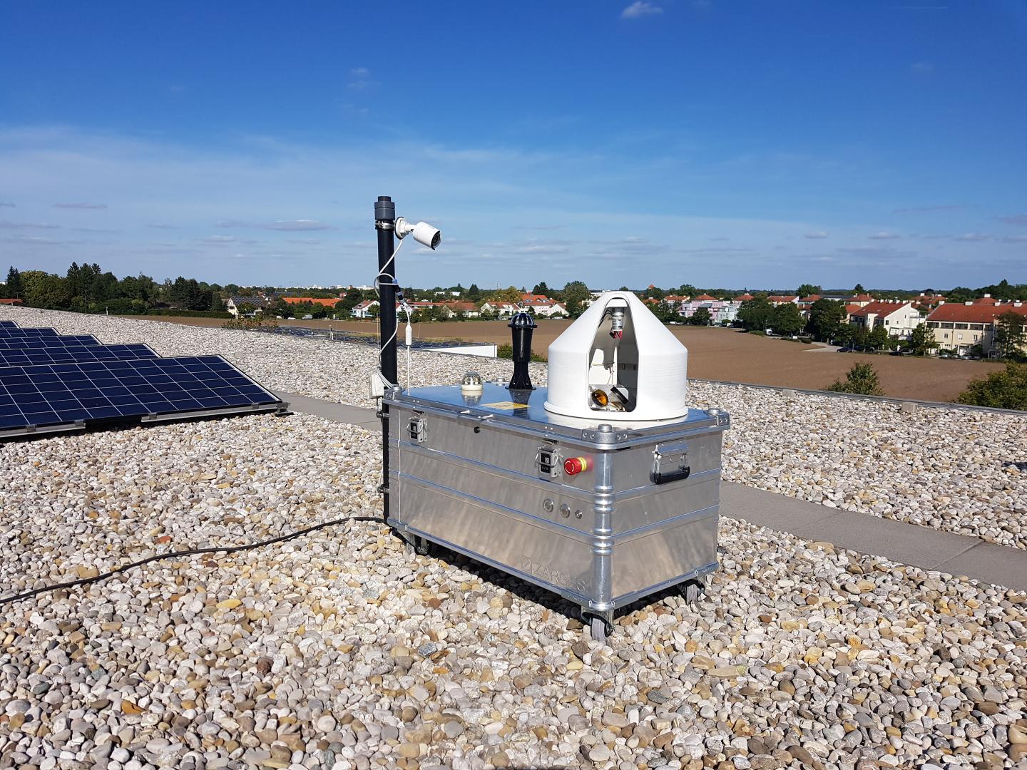 image: Measuring device of the MUCCnet sensor network set up by Prof. Jia Chen, Chair of Environmental Sensing and Modeling, at the TUM Department of Electrical and Computer Engineering of the Technical University of Munich (TUM) on the roof of a building in Taufkirchen.
