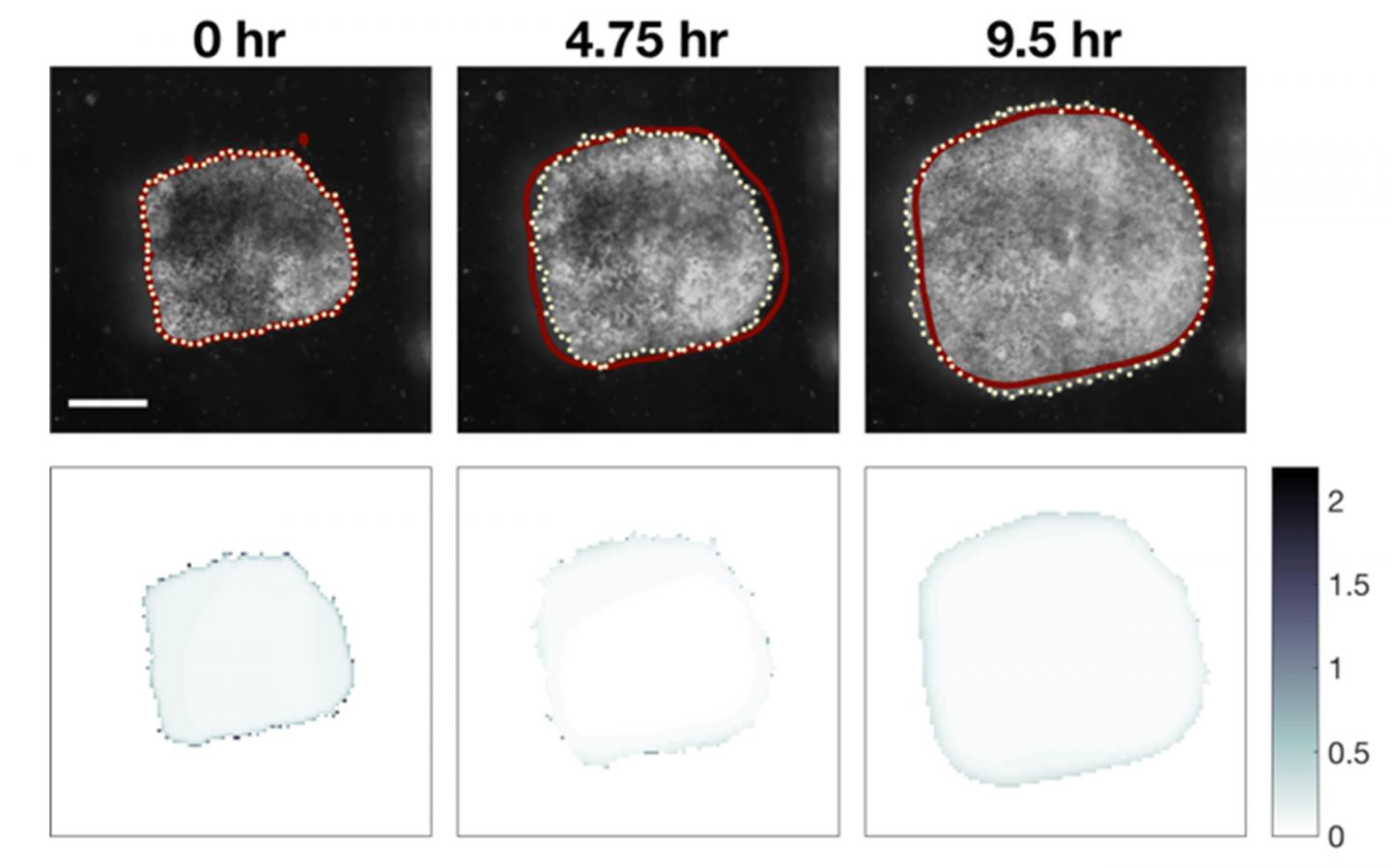 image: Frames from a 10 hour long time-lapse sequence with model prediction (red line) and explant spreading (dotted line). 'Good' models predict not only the extent of the movement but also the amount of mechanical strain as the tissue spreads. The images in the lower row report the error between predicted and actual strain (gradient blue) at the time-points above.