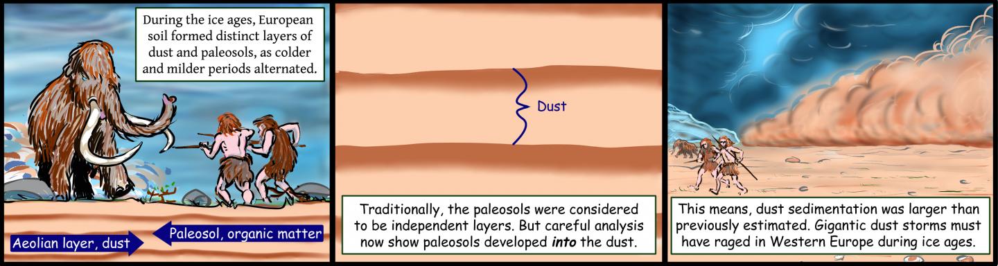 But careful sampling and accurate dating of the loess sedimentation from Nussloch with luminescence and C14 by Denis-Didier Rousseau and colleagues have now shown that this is not the case. Instead, in Europe, paleosols developed down into the underlying layer, not on top of the dust.