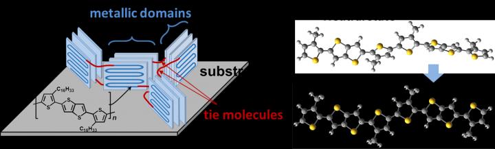 image: Left: The scientists found that their doping technique formed linkages (red) between PBTTT's crystalline parts (blue rectangles).