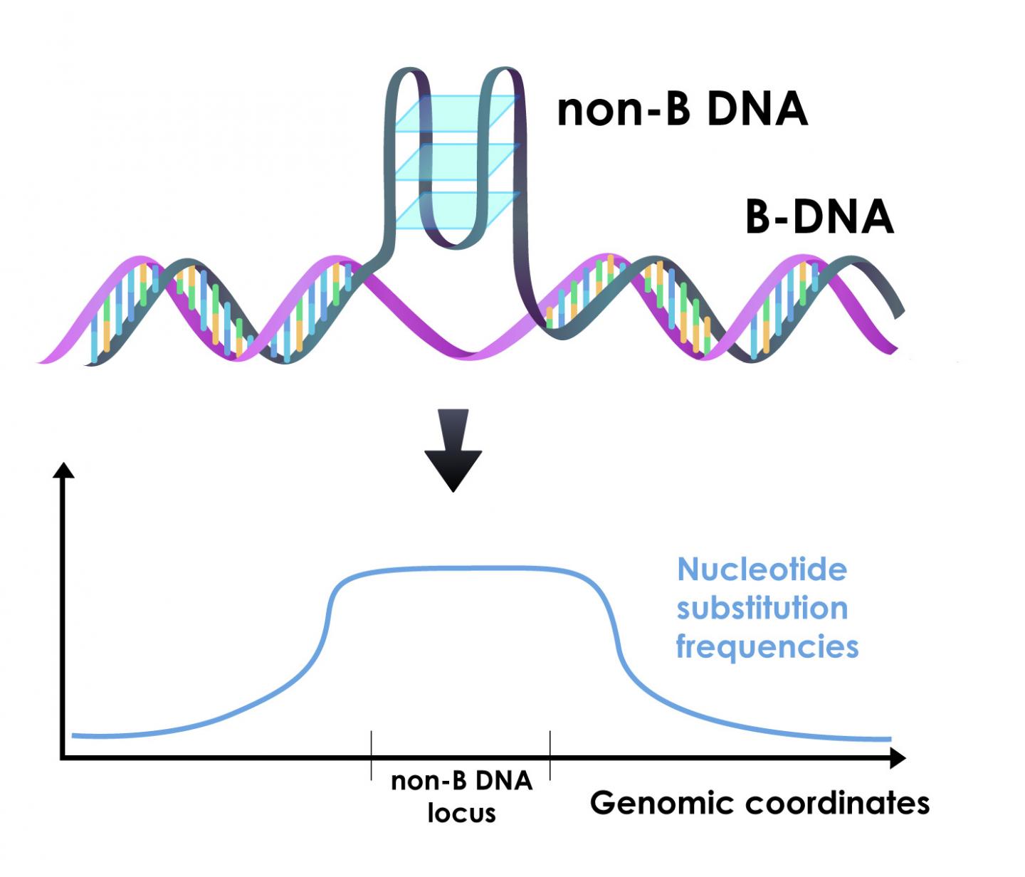 image: New research shows that DNA that folds into conformations other than the classic double helix (non-B DNA), which includes as much as 13% of the human genome, leads to elevated nucleotide substitution rates in both the non-B motifs themselves and their flanking regions. These elevated mutation rates are a major contributor to the regional variation in mutation rates across the genome.