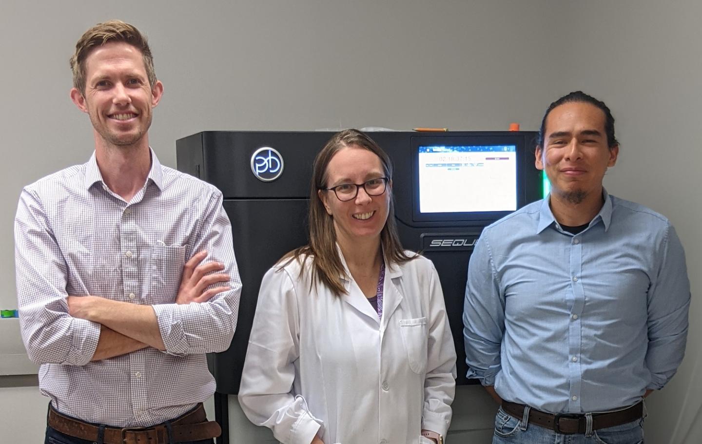 image: Corey Watson, Ph.D., Melissa Smith, Ph.D., and Oscar Rodriguez, Ph.D., with the Pacific Biosciences Sequel IIe DNA sequencing system, housed in the University of Louisville Sequencing Technology Center.
