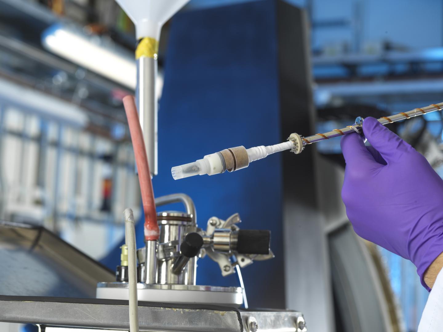 image: Demonstration of a sample containing uranium being studied and carefully loaded onto Diamond's I20-scanning beamline - Credit Diamond Light Source