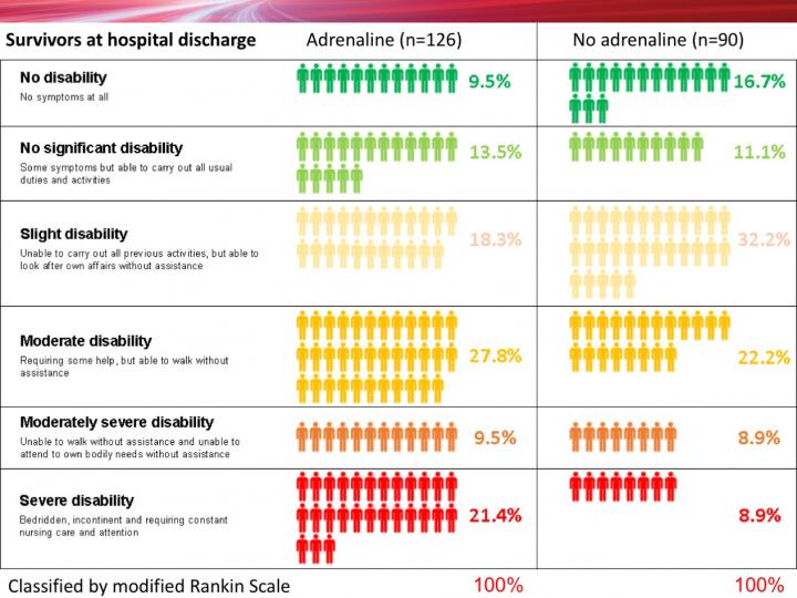 Of 4012 patients given adrenaline, 130 (3.2%) were alive at 30 days compared with 94 (2.4%) of the 3995 patients who were given placebo. However, of the 128 patients who had been given adrenaline and who survived to hospital discharge 39 (30.1%) had severe brain damage, compared with 16 (18.7%) among the 91 survivors who had been given a placebo. In this study a poor neurological outcome (severe brain damage) was defined as someone who was in a vegetative state requiring constant nursing care and attention, or unable to walk and look after their own bodily needs without assistance.