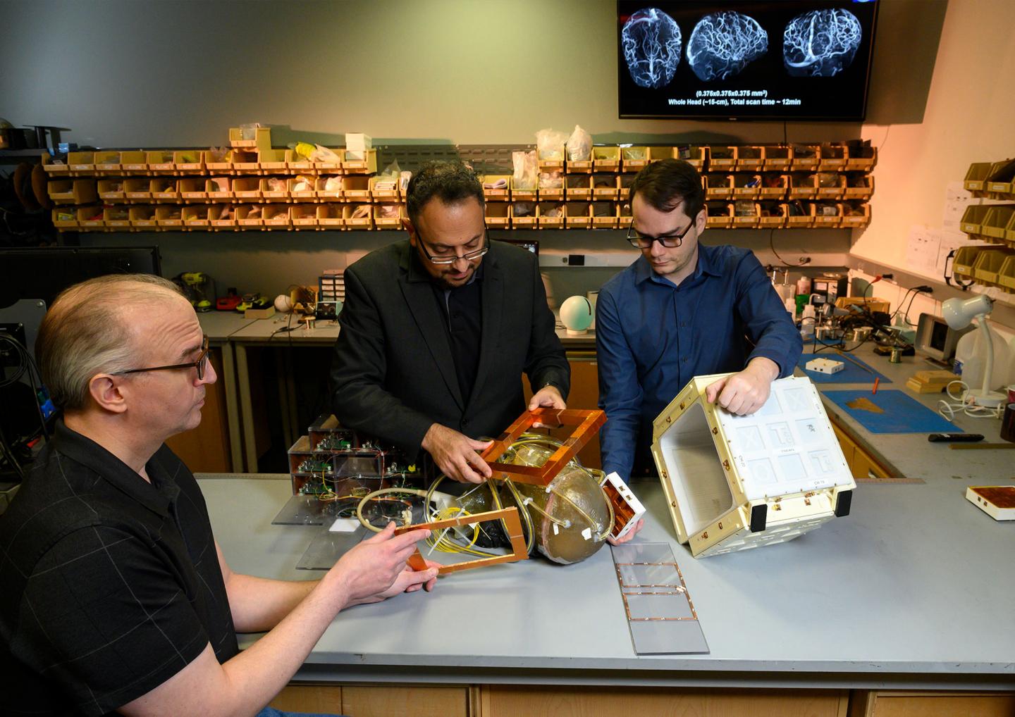 image: Dr. Tamer Ibrahim (middle) and Dr. Tales Santini (right) in the Radiofrequency Research Facility at Pitt's Swanson School of Engineering. Santini holds the housing of the Tic-Tac-Toe coil system.