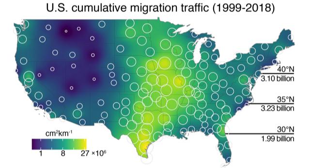 The team made maps of where and when migration occurred over the past 24 years and animated these to illustrate, for example, "the most intensive migration areas in the continental United States," Sheldon explains - a corridor roughly along and just west of the Mississippi River. MistNet also allows researchers to estimate flying velocity and traffic rates of migrating birds.