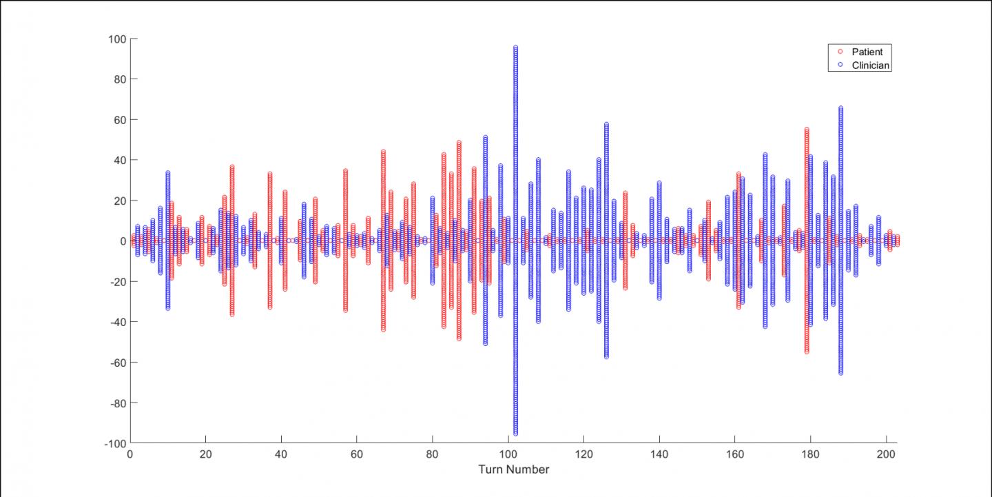 image: In this visualization of a serious illness conversation, each vertical bar represents a speaker turn, and the height of each bar is proportional to the length of the turn, with patient turns in red and clinician turns in blue. The alternating short-long pattern in turn length that dominates these conversations is apparent, and CODYM analysis helps us understand this and other patterns, revealing insights about information flow in conversation.