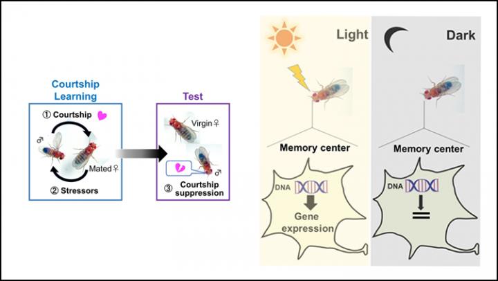 image: Courtship behavior of male fruit flies (left). Light triggers gene expression for memory maintenance (right).
