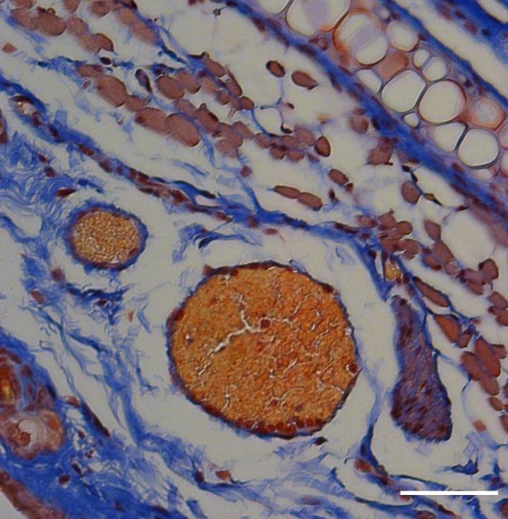 image: An orange-red dye shows that blood clots formed in a mouse ear in which thrombin was released from light-triggered RBCs. Scale bar, 50 μm.