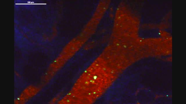 video: Illuminated nanoparticles move through a blood vessel to find cancer. The coloring dyes were incorporated into nanoparticles to allow for more sensitive imaging contrast when identifying cancerous cells.