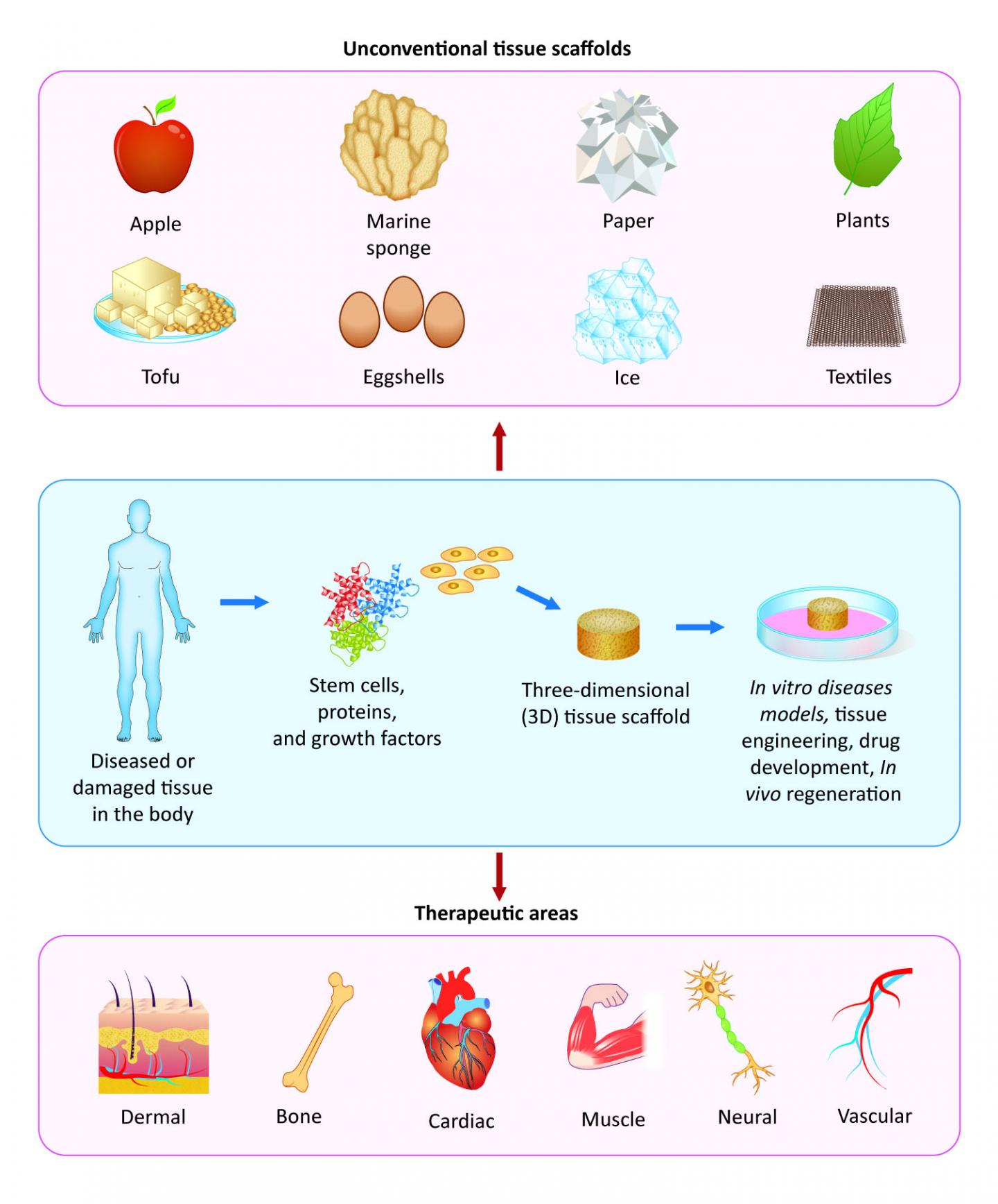 Other researchers have explored a variety of other materials. Tofu is being utilized as a protein-rich scaffold to help wound healing through the promotion of cell adhesion. Incorporating calcium-rich eggshells to reinforce scaffolding materials can boost bone healing and nerve tissue regeneration. Some studies have drawn inspiration from origami to construct 3D paper scaffolds to grow bone tissue.
