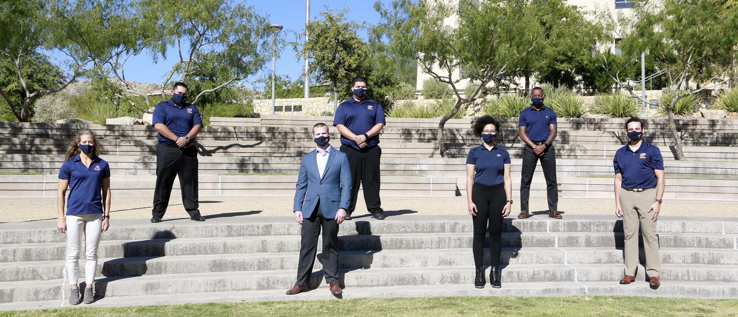 image: Cory M. Smith, Ph.D., bottom row center, director of UTEP's Human and Environmental Physiology Laboratory (HEPL), is the principal investigator on UTEP's COVID-19 Survival Survey. He is joined by UTEP undergraduate and graduate students, top row, from left, Owen Salmon, Joel Jauregui, Heriberto Sanchez and Christopher Bryant; and bottom row, from left, Marni Shoemaker and Jasmin Jenkins.
