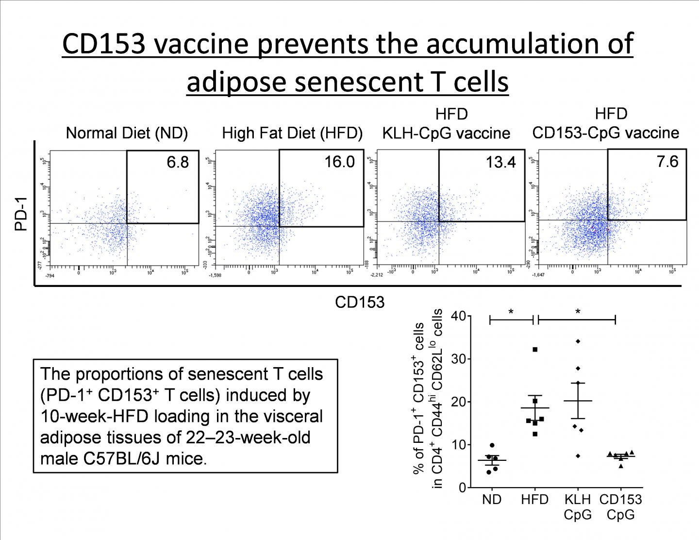 image: Upper: Senescent T cells were defined as PD-1+ CD153+ cells in CD4+ T cells. The proportion of senescent T cells in visceral adipose tissues (VAT) of the high fat diet (HFD) control group was significantly increased compared with that in the VAT of the normal diet (ND) control group. CD153-CpG vaccination of HFD mice resulted in a significant improvement in the accumulation of senescent T cells in VAT.