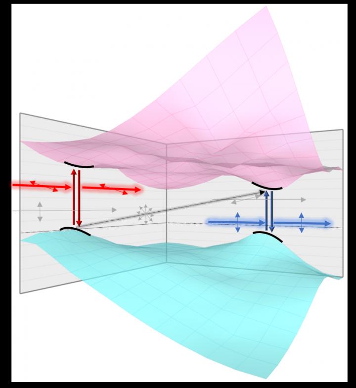 image: Valleytronics utilizes different local energy extrema (valleys) with selection rules to store 0s and 1s. In SnS, these extrema have different shapes and responses to different polarizations of light, allowing the 0s and 1s to be directly recognized. This schematic illustrates the variation of electron energy in different states, represented by curved surfaces in space. The two valleys of the curved surface are shown.