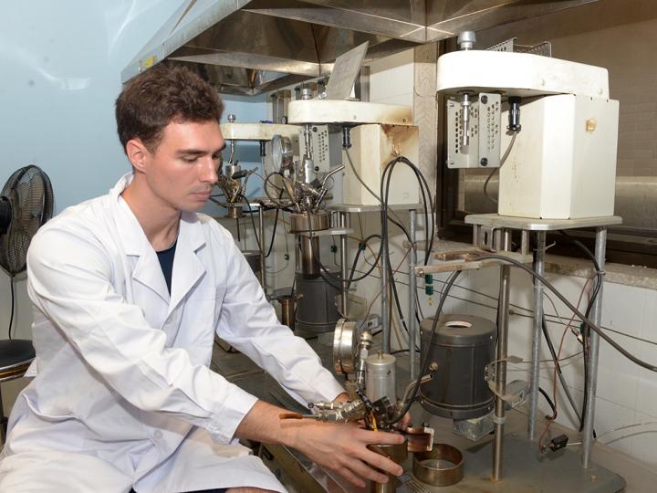 image: Jamison Watson, doctoral student in agricultural and biological engineering at the University of Illinois, prepares a hydrothermal liquefaction batch reactor for the conversion of algae into biocrude oil and wastewater.