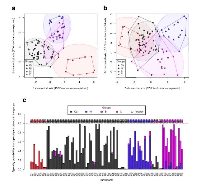 image: Supplementary Figure 1. The anatomy of the vocal tract shows continuous and overlapping but identifiable variation between broad ethno-linguistic groups. We show the results of the Canonical Variate Analysis (CVA) of 57 classical anthropological measurements of the oral vocal tract derived from the 3D intra-oral optical scans of n=94 participants from the ArtiVarK sample [ref16], distributed in four broad self-declared ethno-linguistic groups. These groups are: "Ca" = European or North American of European Descent, speaking Indo-European (mostly Germanic and Romance) languages; "NI" = North Indian, speaking Indo-Aryan languages; "SI" = South Indian, speaking Dravidian languages; and "C" = Chinese, speaking Sino-Tibetan languages. Panels (a) and (b) show the distribution of the participants (represented by their group) in the space of the first three Canonical Axes (CVs; explaining, sequentially, 49.3%, 37.6% and 13.1% of variance); the solid polygons are the convex hulls and the colored ellipses are the 95% confidence ellipses. Panel (c) plots the posterior probabilities of each participant belonging to the four groups (vertical bars), while the top symbols show the actual group (the squares) and the assigned group (the circles; gray circles represent "outlier" participants which cannot be assigned to any group because they are below the horizontal solid line of the 5% threshold); the dotted horizontal line shows the probability of 1.0. In this case, CVA is very successful at recovering the groups despite a few misclassifications and "outliers" (84% overall classification accuracy) and it can be seen that, while overlapping, the four groups are separated by the first three CVs.