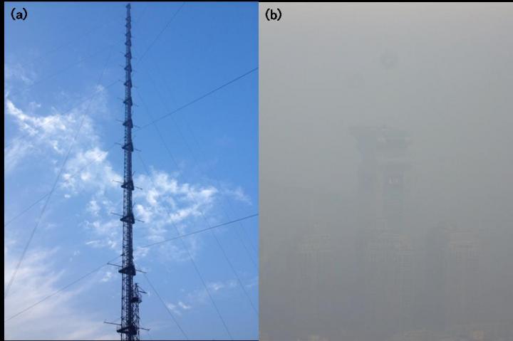 image: Photos taken at (a) the ground level (up), and (b) 280 m (down) on the Beijing 325 m Meteorological Tower at 8:30 am, Nov. 21st, 2014.