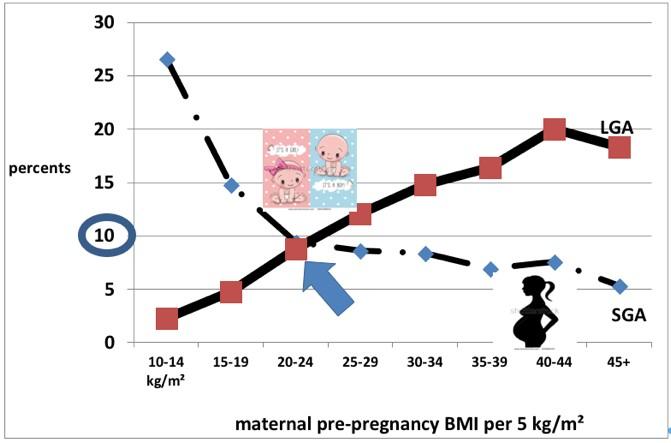 To test these claims, Dr. Robillard and the team carried out a 16.5-year observational study. They recorded the pre-pregnancy BMI, weight gain, and weight of the baby of 52,092 women who gave birth at full term. The first finding was that only women with a normal BMI had a balanced risk of having an SGA or LGA baby (both 10 percent risk); they call this crossing point the Maternal Fetal Corpulence Symbiosis (MFCS).