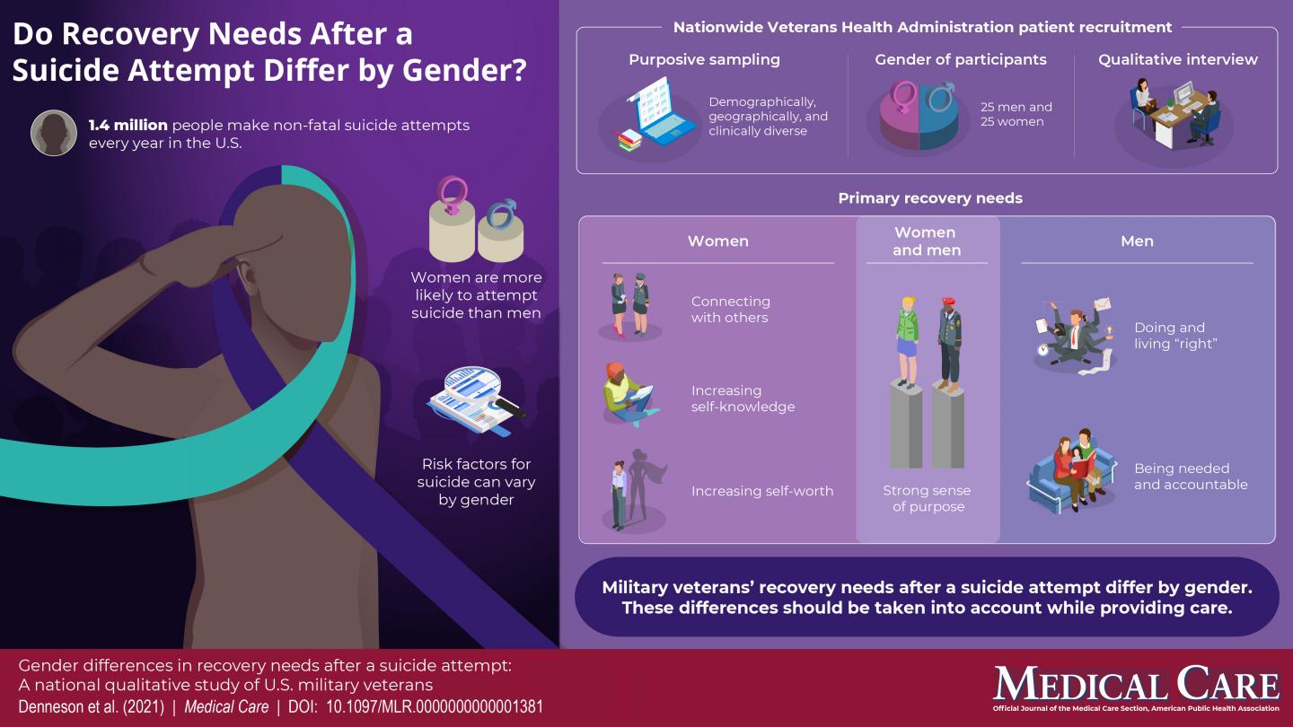 January 25, 2021 - What care do veterans need when recovering after suicide attempts? The answer may be different for women compared to men veterans, reports a qualitative study in Medical Care, part of a special issue devoted to new research on suicide risk and prevention in women. The journal is published in the Lippincott portfolio by Wolters Kluwer.