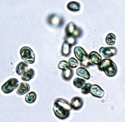 Micrograph of photosynthetic algae (cryptophytes) showing the bright blue coloring of their light-harvesting complexes: special proteins that specialize in capturing energy from sunlight.