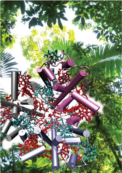 Half the green pigment (chlorophyll) in this Costa Rican rain forest is bound in the light-harvesting complex LHCII (shown in the inset). By studying these natural solar energy antennas, researchers have learnt new physical principles underlying the design of "circuits" that harvest and transport energy from the sun.