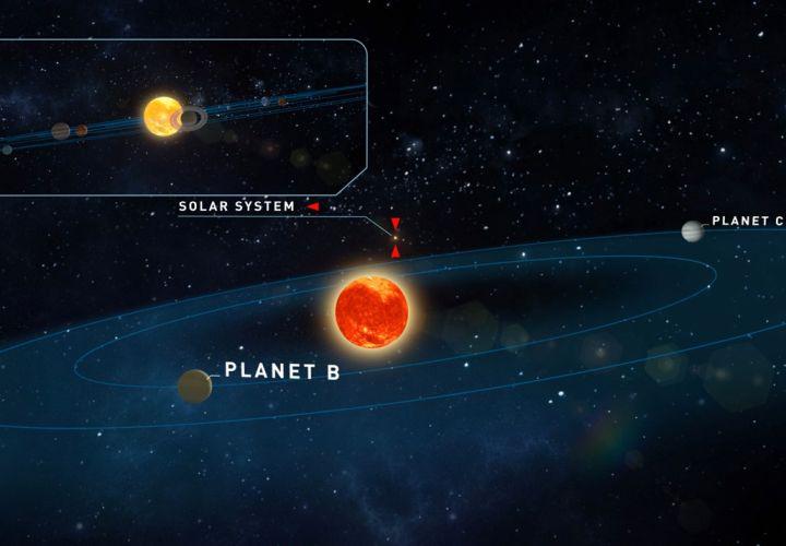 image: Teegarden's Star and its two planets, our Solar System in the background.