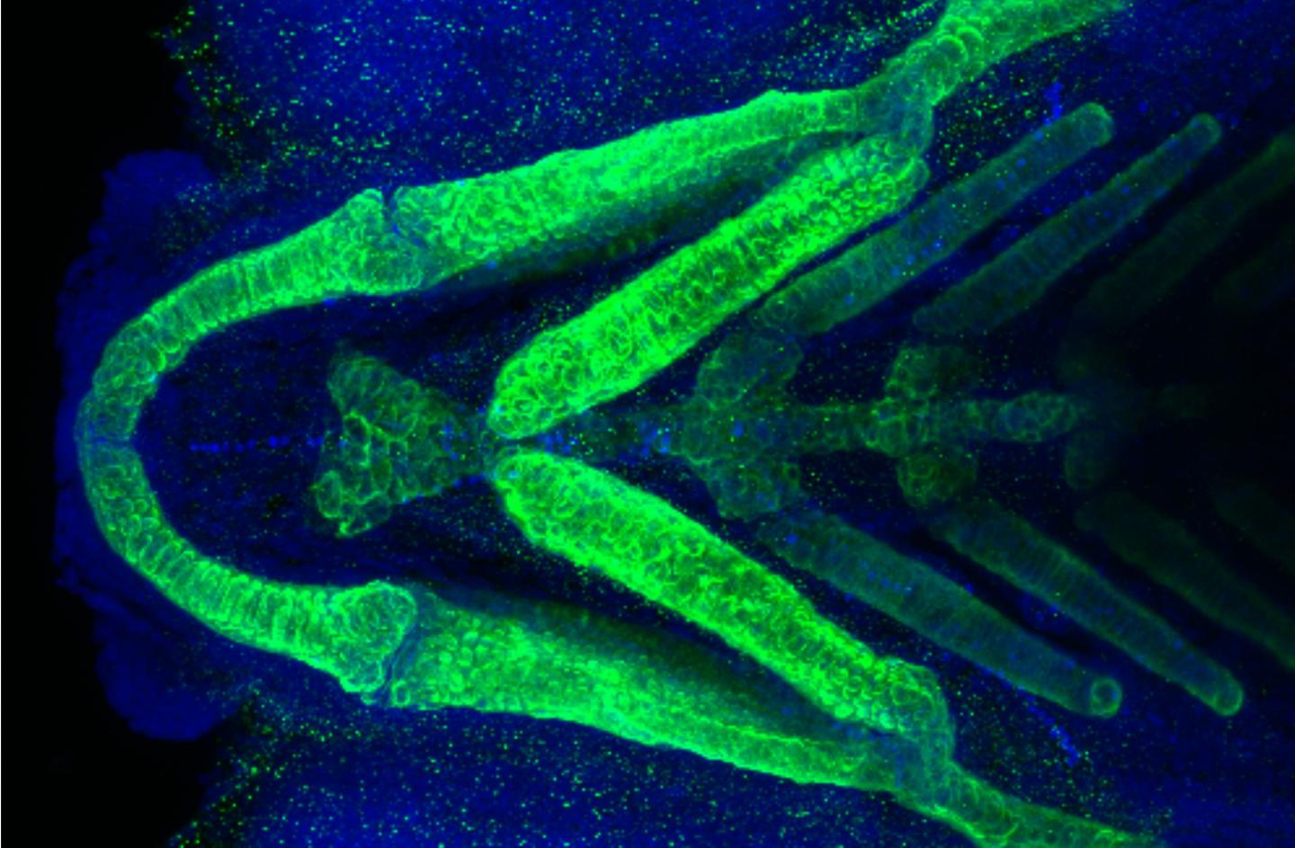 image: Using CRISPR genome editing in zebrafish, scientists with the Fralin Biomedical Research Institute at VTC linked an undiagnosed human disease with a rare genetic mutation that causes craniofacial abnormalities. The mutant zebrafish larva exhibited a striking increase in type II collagen, shown stained green in this underside view of lower jaw structures. Blue stain shows cell nuclei.