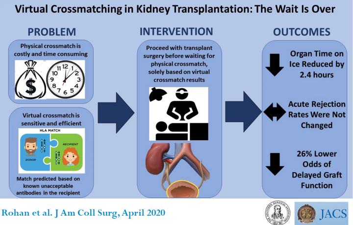 CHICAGO (January 31, 2020): Virtual antibody crossmatching is a safe and efficient way of selecting kidney transplant recipients. Two years after implementing the process, the Medical University of South Carolina (MUSC) division of transplant surgery, Charleston, concluded that the technique was just as accurate and sensitive as physical crossmatch, the current gold standard, and much quicker. Virtual crossmatching reduced the time kidneys were kept on ice while awaiting identification of a suitable recipient, improved scheduling for surgeons and operating room staff, and alleviated emotional and logistical stress on patients who were called to the hospital only to be sent home hours later after a more suitable recipient was identified. A study of the process and its effects on clinical and surgical practice outcomes appears in an "article in press" on the Journal of the American College of Surgeons website in advance of print publication.