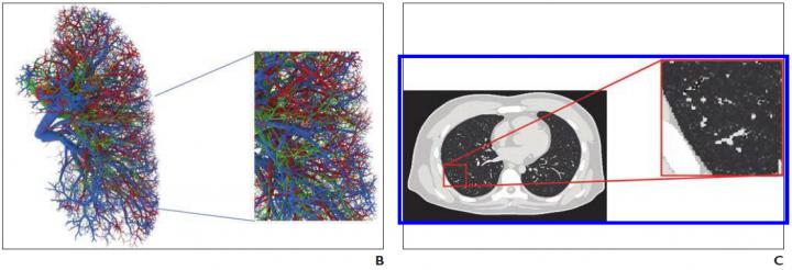 image: B, Representative computational model shows lung stroma intraorgan structure of XCAT phantom that was developed using anatomically informed mathematic model. Inset shows enlarged view for better visibility of details and small structures. C, Voxelized rendition (ground truth) of XCAT phantom highlights detailed model of lung parenchyma. Inset shows enlarged view for better visibility of details and small structures.