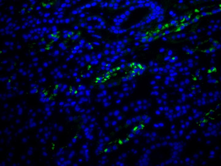 image: FISH images from kidney biopsy of the DRESS patient showing HHV-6 encoded sncRNA-U14 (green). DNA is counter stained with DAPI (blue).