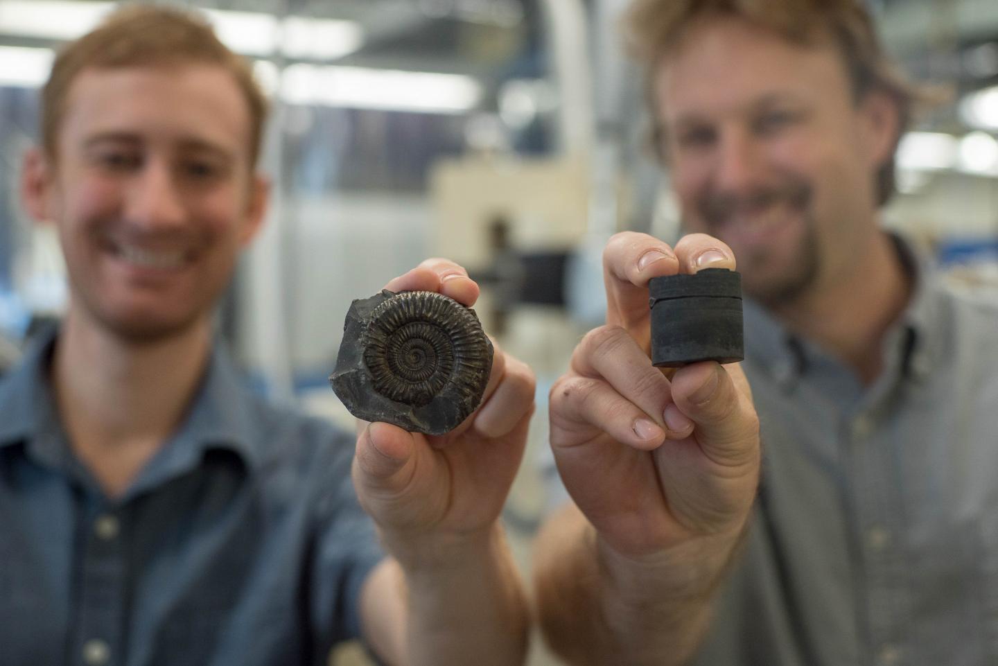 image: Postdoctoral Fellow Theodore Them (left, holding an extinct fossil sample) and Assistant Professor Jeremy Owens (right, holding a rock core sample). The researchers used the samples to study the global record of oxygenation.