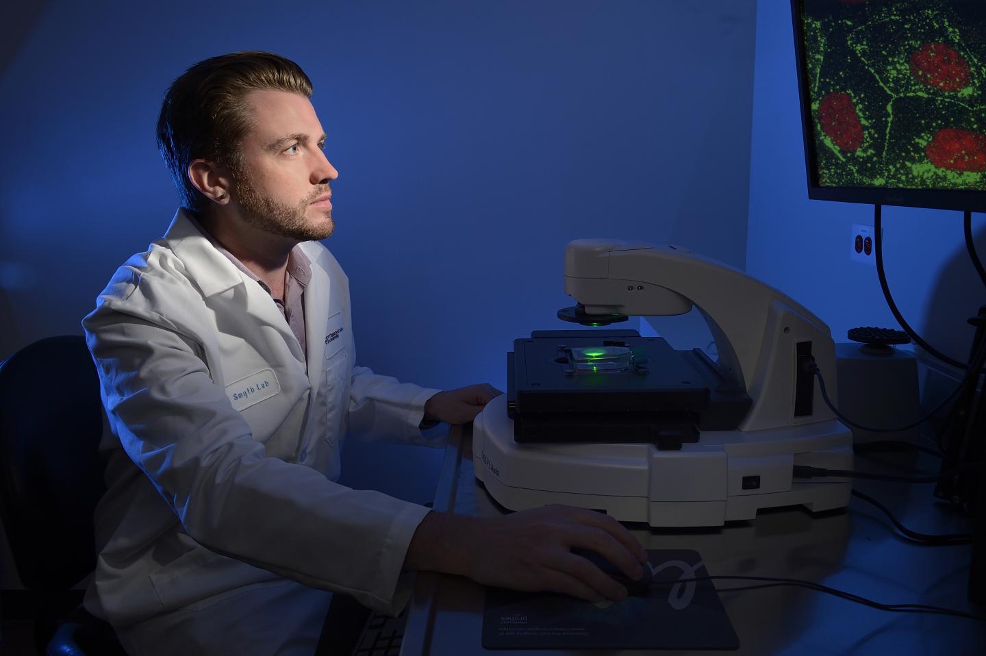 image: Led by Assistant Professor James Smyth (pictured here), a team of researchers at the Virginia Tech Carilion Research Institute used super resolution microscopy to gain insight into how an individual cancer cell can alter its genetic instructions to metastasize throughout the body.