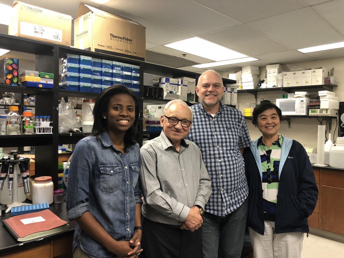image: From left, Taylor Smith, MS, Jacek Hawiger, MD, PhD, Jozef Zienkiewicz, PhD, and Yan Liu, MD, and colleagues developed a peptide that may protect against life-threatening microbial inflammation with underlying metabolic syndrome.