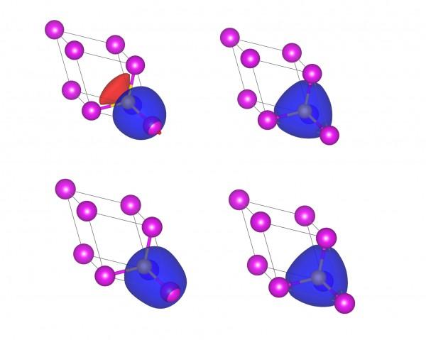 image: Comparison of Wannier functions resulting from different minimization schemes in gallium arsenide (larger pink spheres are Ga cation atoms and yellow spheres are As anions).