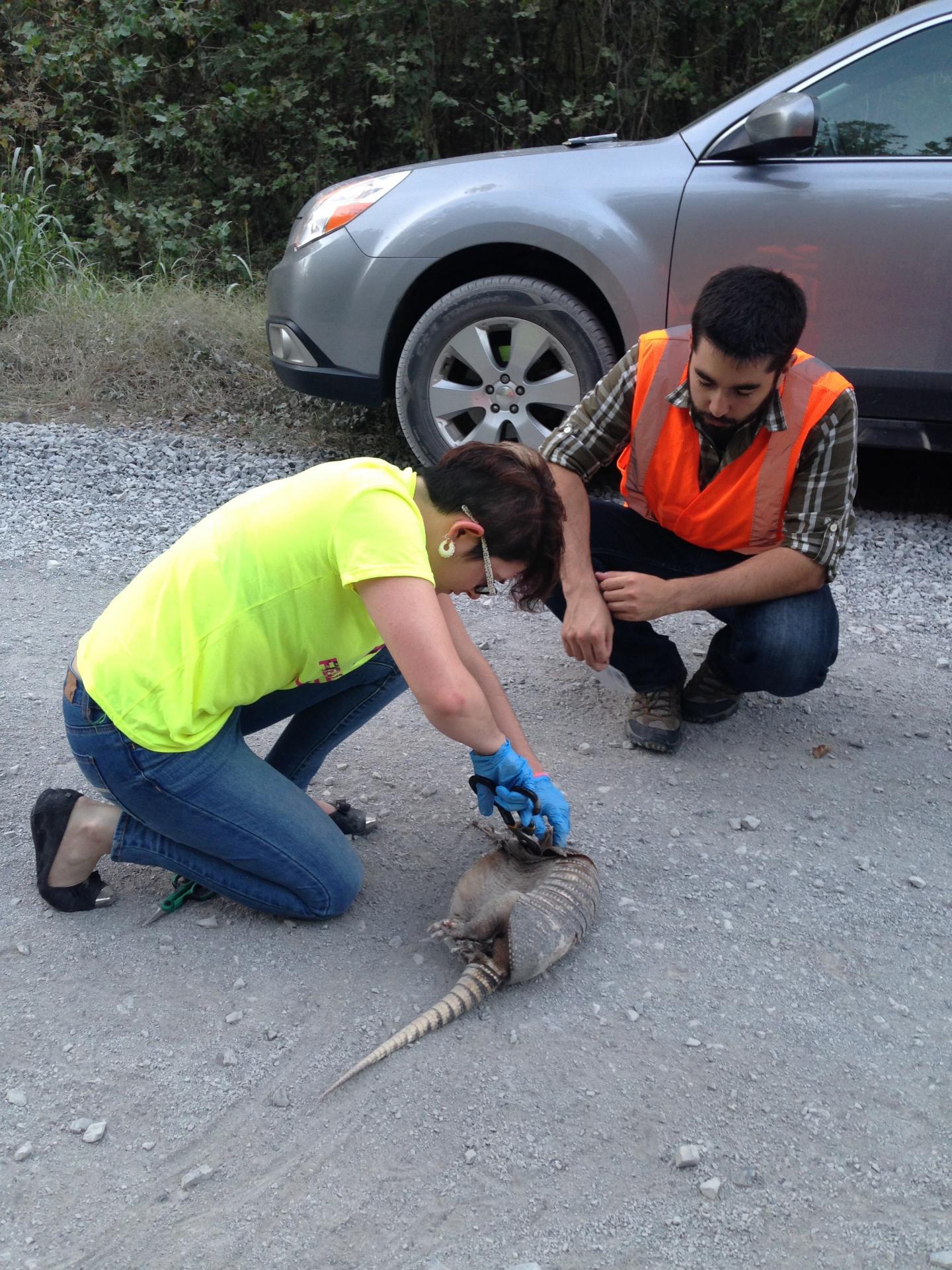 image: The researchers salvaging tissue from a roadkill armadillo.